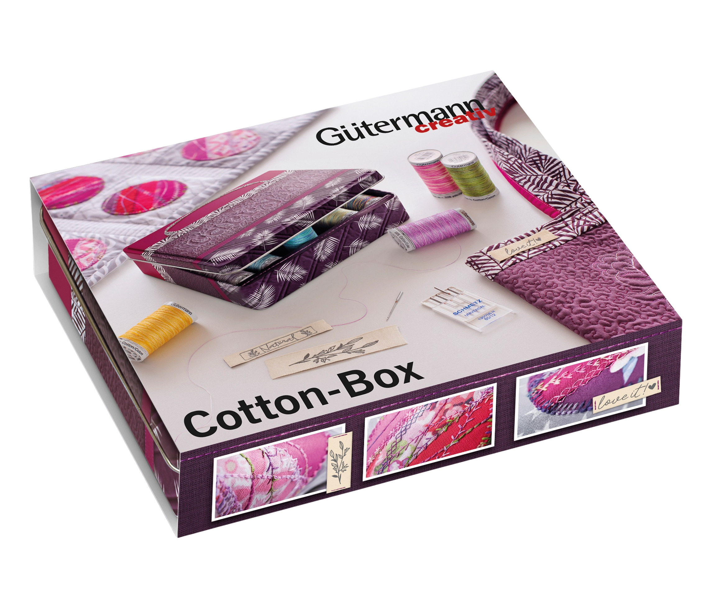 Beskrivelse Metallboks 14dx17b cm, 3,5 cm h med 100% mercerisert bomull (glatt sytråd) Inneholder: 12 sneller sytråd med 300 m flerfarget cotton30 - bomull til alle stoffer fra Gütermann. 5 universal synåler fra Schmetz 80/12 3 stykk Cottonera premium label fra Dortex. Inneholder følgende fargenumre: 4001,4002,4006,4030,4025,4109,4028,4014,4016,4013,4020,4106 |