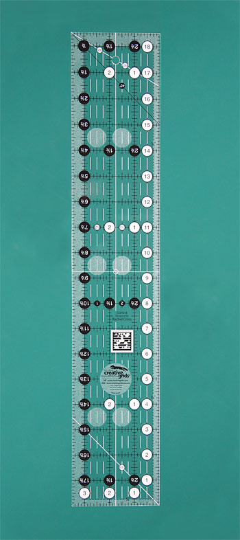 Beskrivelse This 3 1/2" x 18 1/2" rectangle features easy-to-read black and white markings printed in 1" grids marked in 1/8" and 1/4" increments. Use the easy-to-read, numerical black numbers (printed on white dots) and the 1/4" grip sides to cut whole inches. These 1/4" grip sides accentuate the dashed lines printed 1/4" away from two adjoining edges to aid in trimming seam allowances. Use the patented Turn-A-Round feature - designated by the easy to read, numerical white numbers (printed on black dots) and the 1/2" grip sides - to add the 1/2" seam allowance. Our exclusive gripper holds the fabric while cutting when pressure is applied. The ruler includes 30°; 45°; and 60° angles. White horizontal and vertical lines are printed on the rectangle so the center of the ruler is easily distinguishable. |