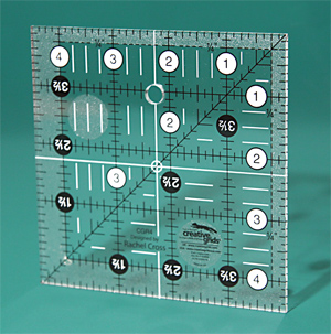 Beskrivelse This 4 1/2" square features easy-to-read black and white markings printed in 1" grids marked in 1/8" and 1/4" increments. Use the easy-to-read, numerical black numbers (printed on white dots) and the 1/4" grip sides to cut whole inches. These 1/4" grip sides accentuate the dashed lines printed 1/4" away from two adjoining edges to aid in trimming seam allowances. Use the patented Turn-A-Round feature – designated by the easy to read, numerical white numbers (printed on black dots) and the 1/2" grip sides – to add the 1/2" seam allowance. Our exclusive gripper holds the fabric while cutting when pressure is applied. A 45° angle is printed in black. White horizontal and vertical lines are printed on the square so the center of the ruler is easily distinguishable. |