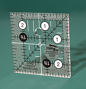 Beskrivelse This 2 1/2" square features easy-to-read black and white markings printed in 1" grids marked in 1/8" and 1/4" increments. Use the easy-to-read, numerical black numbers (printed on white dots) and the 1/4" grip sides to cut whole inches. These 1/4" grip sides accentuate the dashed lines printed 1/4" away from two adjoining edges to aid in trimming seam allowances. Use the patented Turn-A-Round feature – designated by the easy to read, numerical white numbers (printed on black dots) and the 1/2" grip sides – to add the 1/2" seam allowance. Our exclusive gripper holds the fabric while cutting when pressure is applied. A 45° angle is printed in black. White horizontal and vertical lines are printed on the square so the center of the ruler is easily distinguishable. |