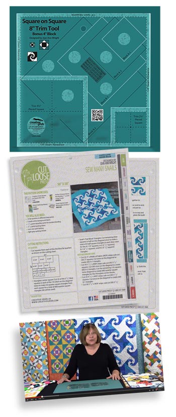 Beskrivelse Create 4 inch or 8 inch square on square blocks. No calculations needed - all the cutting measurements are printed right on the tool! Trimming each round as triangles are added creates perfectly square, uniform blocks. The popular Snail's Trail block is now easier than ever - simply change the colors of the triangles! |
