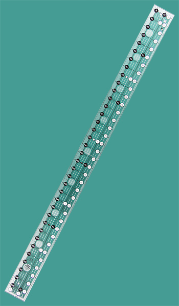 Beskrivelse This 2 1/2" x 36 1/2" yardstick features easy-to-read black and white markings printed in 1" grids marked in 1/8" and 1/4" increments. Use the easy-to-read, numerical black numbers (printed on white dots) and the 1/4" grip sides to cut whole inches. These 1/4" grip sides accentuate the dashed lines printed 1/4" away from two adjoining edges to aid in trimming seam allowances. Use the patented Turn-A-Round feature – designated by the easy to read, numerical white numbers (printed on black dots) and the 1/2" grip sides – to add the 1/2" seam allowance. Our exclusive gripper holds the fabric while cutting when pressure is applied. The ruler includes 30°; 45°; and 60° angles. White horizontal and vertical lines are printed on the rectangle so the center of the ruler is easily distinguishable. |