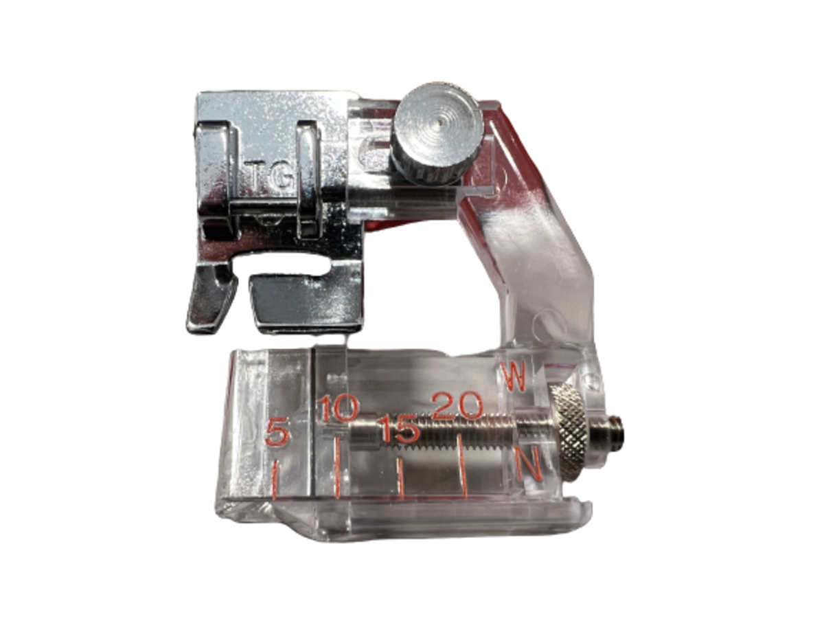 Kantbåndsfot med guide for å sy fast kantbånd som er 5-20 mm brede.