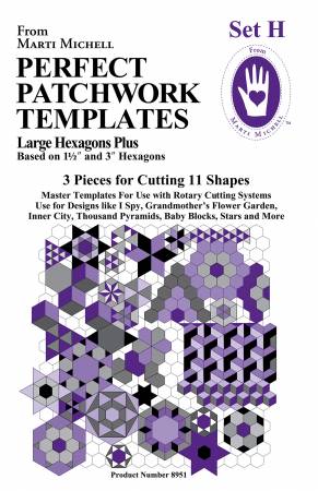 Beskrivelse arge Hexagons Plus. 3 pieces for cutting 11 shapes. We measure hexagons based on the length of a finished side. This template set is based on 1.5in and 3in hexagons, plus companion shapes. Set G and Set H instruction sheets both include many classic 60-degree angle patchwork designs and steps for using the templates as rulers for rotary cutting perfect strip widths. Color: Clear Made of: Acrylic Use: Quilting Templates Included: 3 Templates |