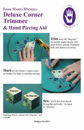 Beskrivelse Includes 45, 53-1/2, 60, 90, 120 and 135 degree angles. Improve your piecing by eliminating "dog ears" on patchwork triangles--and excess fabric on squares--before you sew. Replicate From Marti Michell engineered corners on quick-cut pieces. Confirm angles on quilt pieces you might have quick-cut with a ruler or even cut with scissors. Mark the exact dot where seams will cross at the corners. Ideal for hand piecers or machine set-in seams. Includes illustrated instructions. If you are using our original Corner Trimmer 8064, you already know the excellent advantages of trimmed corners and you will appreciate the advantages of the Deluxe Corner Trimmer. Made of: Plastic Use: Quilting Template |