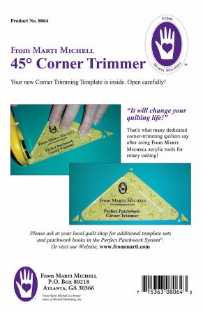 Beskrivelse The From Marti Michell Corner Trimmer template can be used to trim the corners of any right angle triangle piece, regardless of the size of the triangle. Trimmed corners promote accurate piecing, eliminate "dog ears" before sewing and reduce bulk at corners for easier quilting by hand or machine! Engineered corners are just one of the quality trademarks you will find on From Marti Michell products. When Marti travels to teach, she hears from quilters all the time that they especially love the Corner Trimmer because it is just the right size for joining binding strips (instructions included). Includes 8-page tips booklet with color cover. Made of: Acrylic Use: Quilting Templates Size: Approx. 2.5in Tall Included: One Ruler |