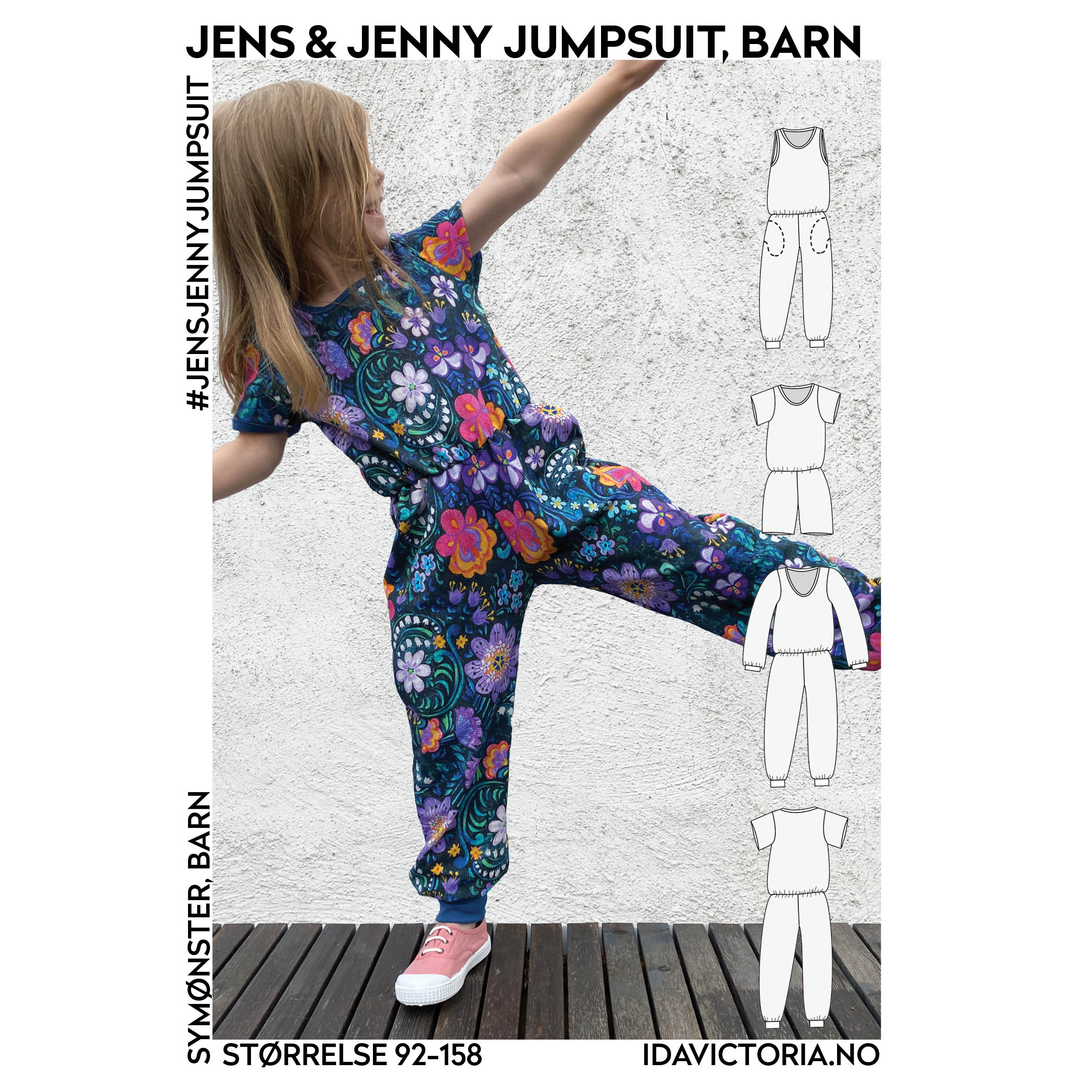 Beskrivelse Jumpsuiten til barn er et praktisk og behagelig plagg for lek, aktivitet og avslapping, med en løs passform og strikk i livet. Den er lett og ledig, og god å bevege seg. Jumpsuiten tas på og av gjennom halsåpningen. Bruk jerseystoff når du syr denne jumpsuiten, fortrinnsvis tynn bomullsjersey eller viskosejersey. Du kan sy jumpsuiten med singletoverdel, med T-skjorte-ermer eller lange ermer, og du kan velge om du vil sy med eller uten lommer. Jumpsuiten kan også sys som shorts. |