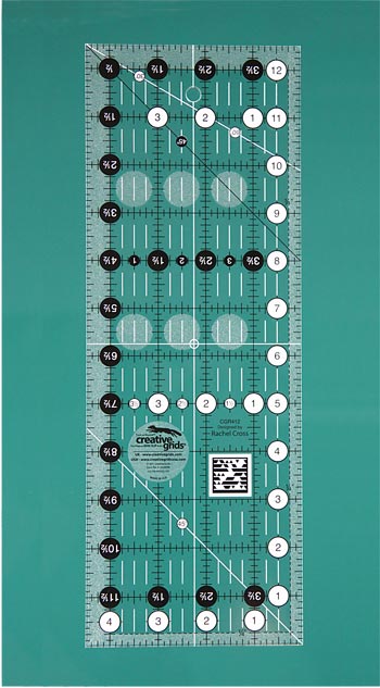 Beskrivelse Ref: CGR412 This 4 1/2" x 12 1/2" rectangle features easy-to-read black and white markings printed in 1" grids marked in 1/8" and 1/4" increments. Use the easy-to-read, numerical black numbers (printed on white dots) and the 1/4" grip sides to cut whole inches. These 1/4" grip sides accentuate the dashed lines printed 1/4" away from two adjoining edges to aid in trimming seam allowances. Use the patented Turn-A-Round feature – designated by the easy to read, numerical white numbers (printed on black dots) and the 1/2" grip sides – to add the 1/2" seam allowance. Our exclusive gripper holds the fabric while cutting when pressure is applied. The ruler includes 30°; 45°; and 60° angles. White horizontal and vertical lines are printed on the rectangle so the center of the ruler is easily distinguishable. |