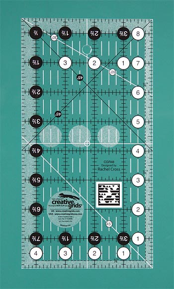 Beskrivelse CGR48 This 4 1/2" x 8 1/2" rectangle features easy-to-read black and white markings printed in 1" grids marked in 1/8" and 1/4" increments. Use the easy-to-read, numerical black numbers (printed on white dots) and the 1/4" grip sides to cut whole inches. These 1/4" grip sides accentuate the dashed lines printed 1/4" away from two adjoining edges to aid in trimming seam allowances. Use the patented Turn-A-Round feature – designated by the easy to read, numerical white numbers (printed on black dots) and the 1/2" grip sides – to add the 1/2" seam allowance. Our exclusive gripper holds the fabric while cutting when pressure is applied. The ruler includes 30°; 45°; and 60° angles. White horizontal and vertical lines are printed on the rectangle so the center of the ruler is easily distinguishable. |