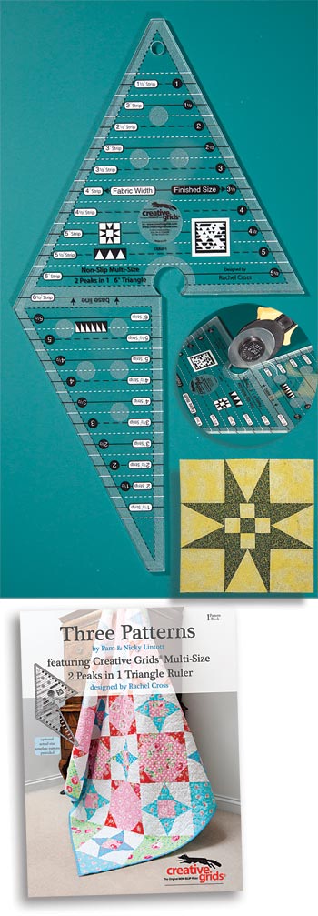 Beskrivelse The Multi-Size 2 Peaks in 1 Triangle features the unique keyhole cut-out concept that sets this two-in-one ruler apart and by simply rotating it you can create many blocks with minimum fuss and wastage. Cut tall and side triangles for triangle within a square blocks and half-rectangles from 1" up to 6" finished and all the half measurements in between. Markings show finished size and indicates strip widths and features the unique non-slip grip for easy accurate cutting. Ruler comes with fully illustrated step by step instructions. Click the video button below to see Nicky Lintott demonstrate how easy it is to use. Features in Pam and Nicky Lintott book Quick Quilts with Rulers. |