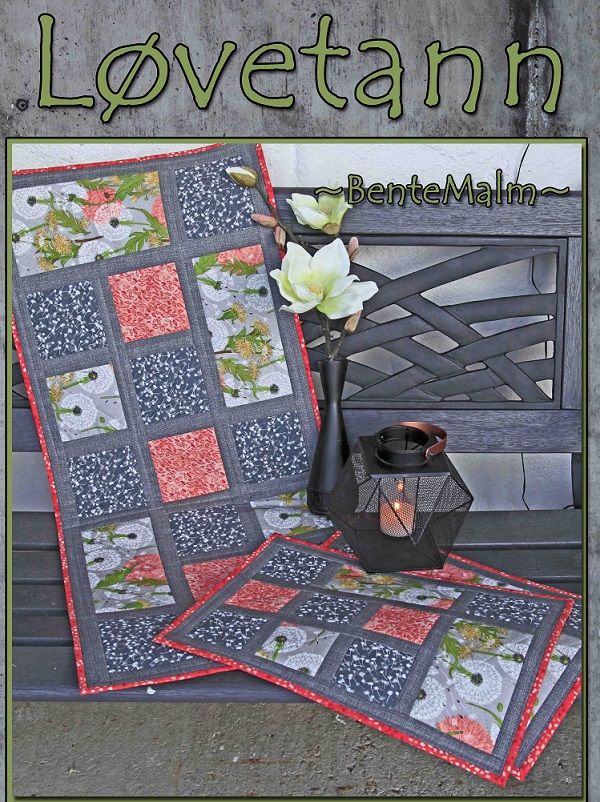 Beskrivelse Løper og dekkebrikker i enkel lappeteknikk. Mønsteret har fått navn etter orginalstoffets trykk, men andre stoff kan like gjerne brukes. Str, løper: 16 ½” x 38 ½” (42 cm x 98 cm) Str, dekkebrikker: 17” x 12 ½” (43 cm x 32 cm) Teknikker: Tradisjonell lappeteknikk. Quilting med rettsømsfot. |