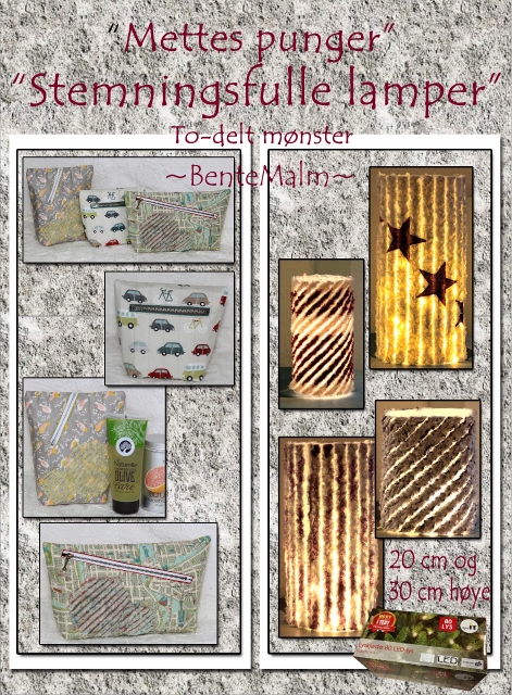 Beskrivelse To-delt mønster. Punger og liten toalettveske. Str: 11? x 6? x 3?, str: 7? x 8? x 3?, str: 7? x 6? x 3? (b x h x d, målt på det bredeste). Glidelåsen er sydd som ’passpoilert’ lomme. Dette er en enkel og rask måte å sy glidelås på, som mange kan klare. Stemningsfulle lykter: Str: 20 cm – 30 cm høyde. Rufseteknikk. Lyktene er enkle å lage. ”Innmaten” er 1,5 liters vannflaske, 5 liters vanndunk og eller malplast. Det er brukt lyskjeder med Led-lys, enten batteridrevet eller på strøm. Til de største lampene kan det brukes kjeder med ’juletrelys’ på 40 – 80 pærer. (OBS, Bruk LED-lys som |