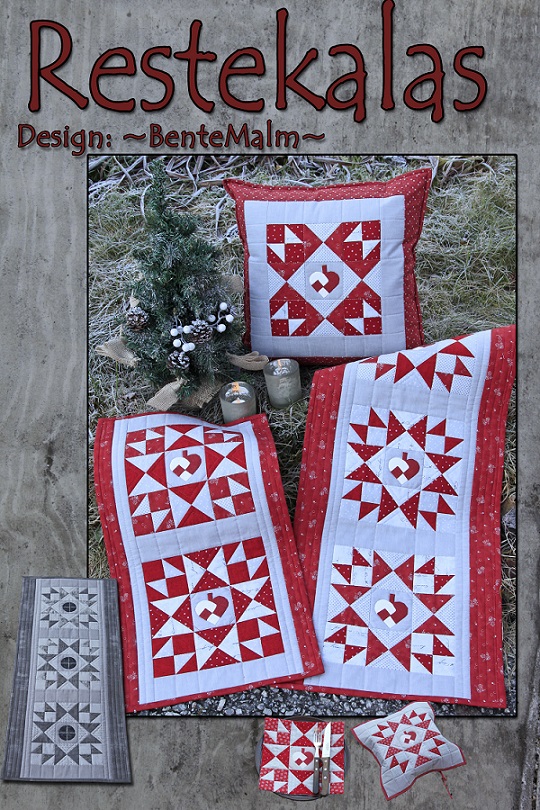 Beskrivelse Restekalas. (navnet kommer av at det kan brukes mange forskjellige stoff”rester”). Mønsteret gir forskjellige modeller der du kan bruke stoff fra egne hyller. Cake Mix: Blokkene er laget ved hjelp av “Cake Mix” recipe 9. Mønsteret inneholder også forklaring uten bruk av Cake Mix. Løper, stor. Str: 15 ½” x 35 ½” (40 cm x 90 cm). Løper, liten. Str: 13 ½” x 24” (34 cm x 61 cm). Putetrekk. Str: 17 ½” x 17 ½” (44,5 cm x 44,5 cm). Se også flere modeller til samme mønster på neste bilde. |