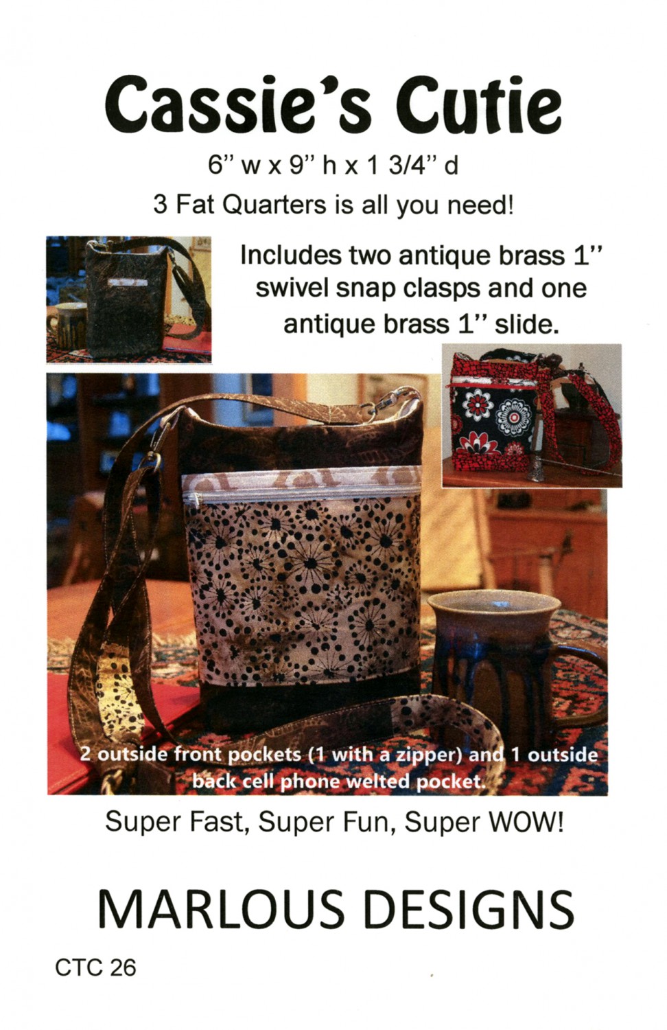 6in W x 9in H x 1-3/4in D. 3 Fat Quarters is all you need! Includes two antique brass 1in swivel snap clasps and one antique brass 1in slide. This small cross body bag is perfect when all you need are the essentials.