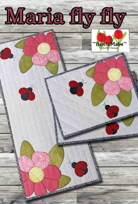 Beskrivelse Liten løper og spisebrikker med applikasjoner. Str, løper: 13 1/2” x 31 1/2” (34 x 80 cm). Str, spisebrikke: 16 1/2” x 12” (42 x 30 cm). Teknikker: Quilting med rettsømsfot / overtransportør, applikasjoner med knapphullsting (maskinsøm). Marihønenes ’’værhår’’ og sorte prikker er brodert med moulinégarn. |