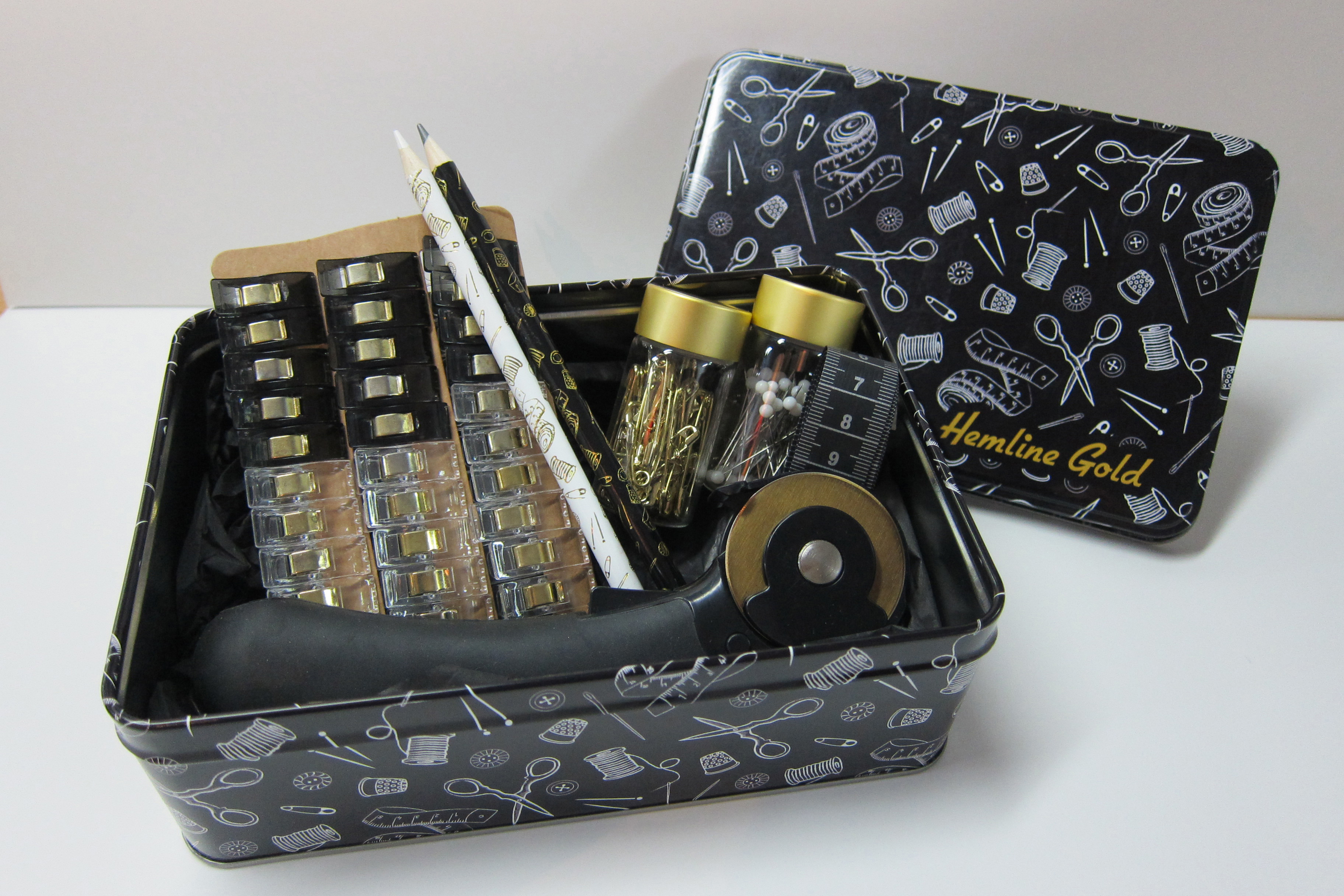 Beskrivelse HEMLINE GOLD SY-KIT LARGE 19 X 13 X 6,5 CM indeholder følgende: 30 stk quilte clips. 2 stk skrædderblyanter i hvid og grå. 1 stk målebånd, 150 cm / 60? 1 gladrør sikkerhedsnåle, 50 stk i messing i ass. størrelser. 1 glasrør nipsenåle, 60 stk str 58 x 38 mm. m/ hvid plasthoved. 1 rulleskære m/ 45 mm messing klinge. |
