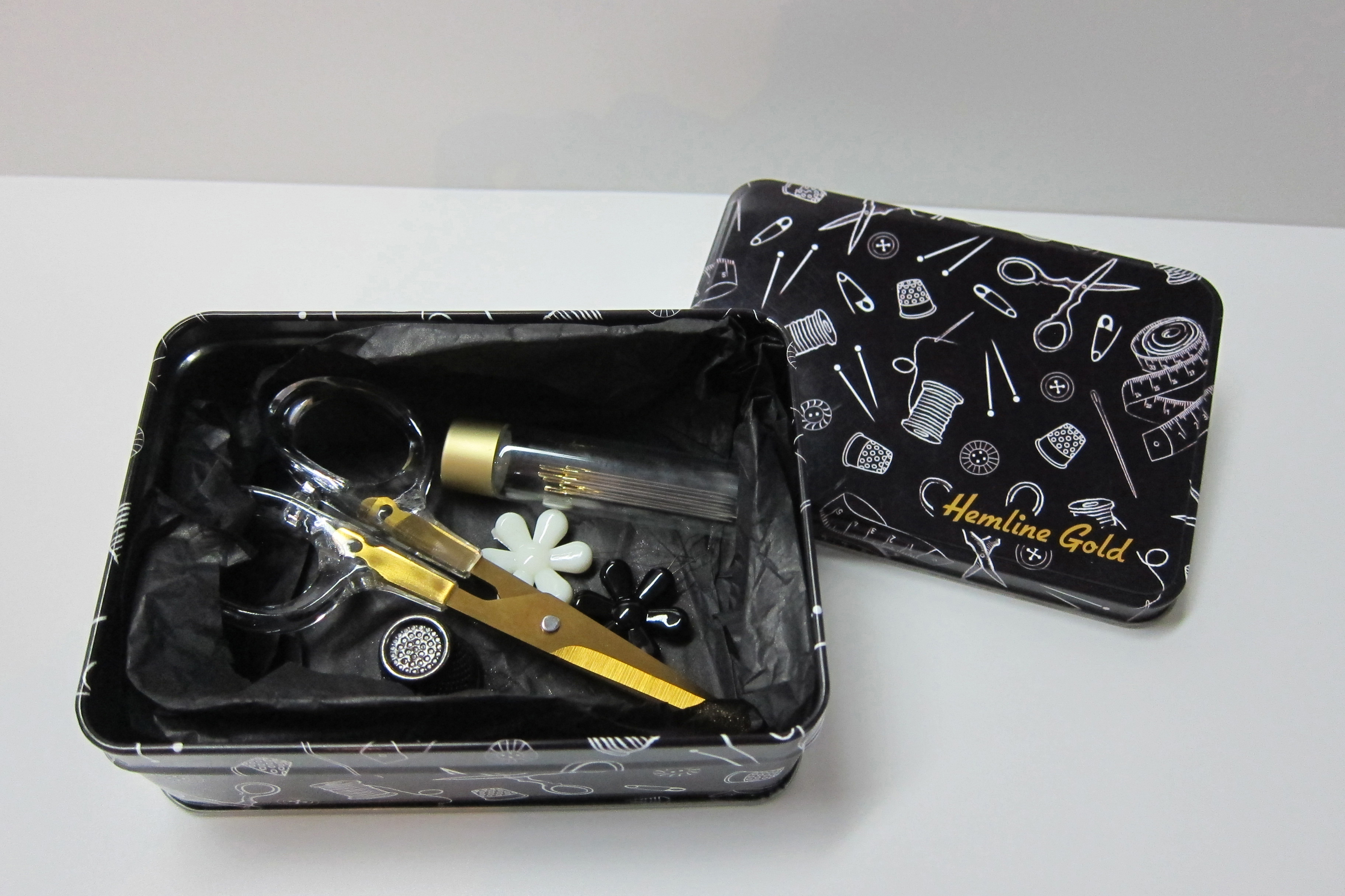Beskrivelse HEMLINE GOLD SY-KIT SMALL 12 X 8,5 X 4,3 CM Inderholder følgende: 2 stk blomster nåletrædere i sort og hvid. 1 stk finderbøl i str. L. 1 glasrør m/ 10 ass. håndsynåle m/ guld øje. 1 broderi saks 5? |