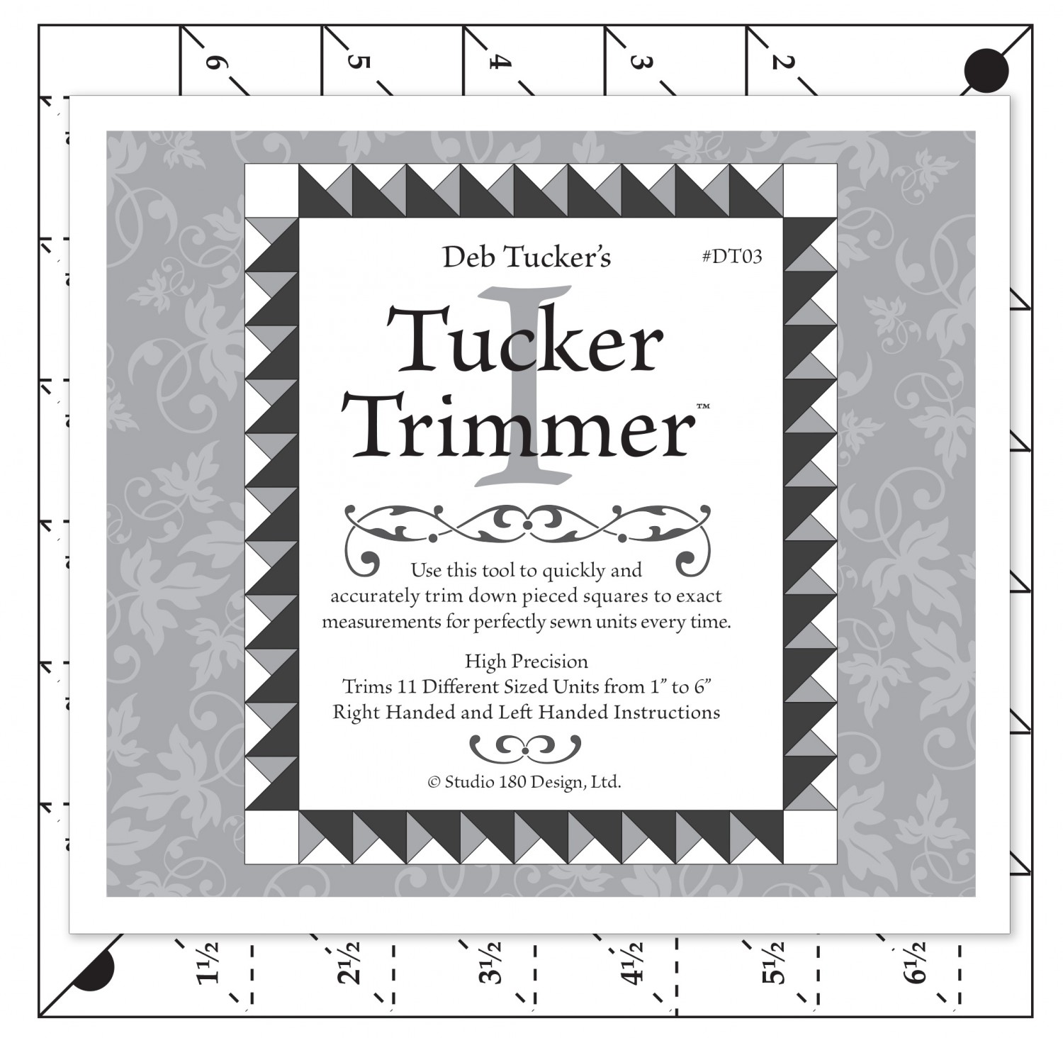 Beskrivelse The Tucker Trimmer tool was designed to help quilter’s quickly and easily trim down units that are made with triangles: half square triangle squares, quarter square triangle squares (hourglass units), and combinations of half square and quarter square triangle squares (combination units). It has multiple diagonals which allow you to align ruler guide lines with unit seam lines to quickly locate the exact center of pieced units. This makes trim down easy, precise, and perfect every time. No more figuring, or guessing, or struggling to find a center point. I use it for much more than just trimming however and consider it my “must have” tool every time I head to my cutting table. Color: Clear Made of: Acrylic Use: Quilting Template Size: 7in x 7in |