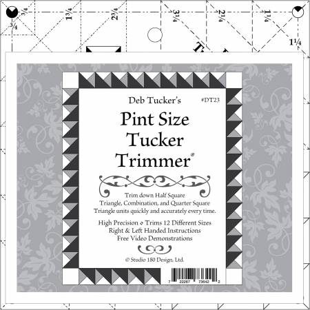 Beskrivelse The Pint Size Tucker Trimmer combines the 12 smallest sizes from our original Tucker Trimmer I and Tucker Trimmer II into one easy to use tool giving you access to ¼”, ½”, ¾” and whole inch size units all on the same tool. Use it to quickly and accurately trim down units that are made with triangles: half square triangle squares, quarter square triangle squares (hourglass units), and combinations of half square and quarter square triangle squares (combination units). It has multiple diagonals which allow you to align ruler guide lines with unit seam lines to quickly locate the exact center of pieced units. This makes unit construction easy, precise and perfect every time. The Pint Size Tucker Trimmer is compact, easy to read, and provides the same great results you've come to expect from all Studio 180 Design tools. It is the perfect tool for those who prefer to make quilts using smaller units! Made of: Acrylic Size: 6-3/4in x 6-3/4in Use: Template |